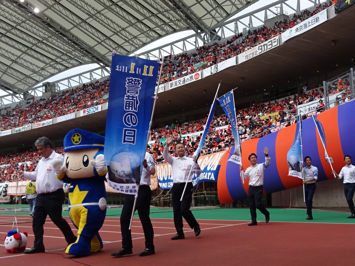 ハーフタイムでは、新潟県警マスコット「ひかるくん」&警備業界マスコット「ガードくん」と共に場内パレードを行い、特殊詐欺の防止対策と警備業の役割について観客の皆様にお伝えしました。